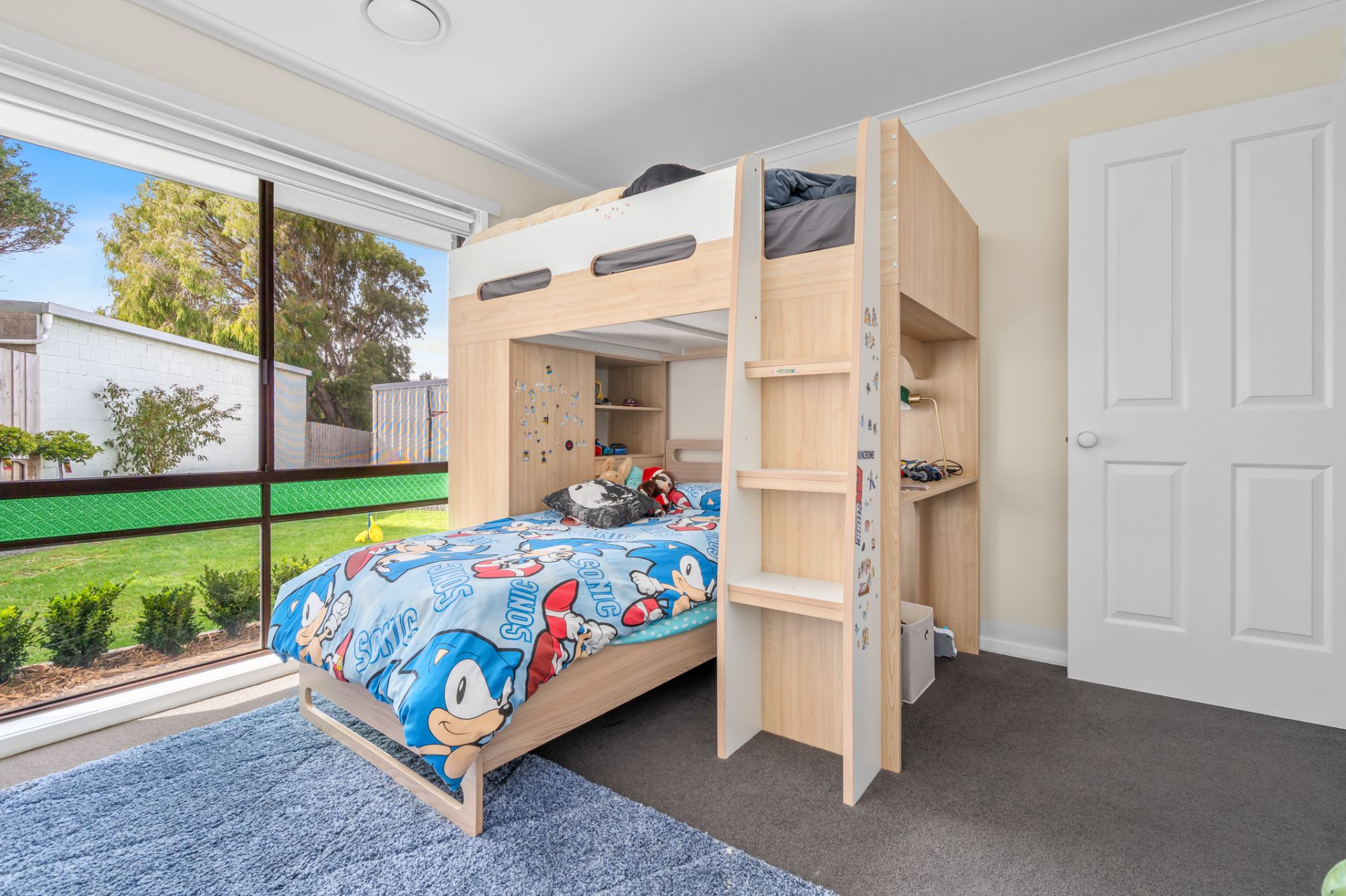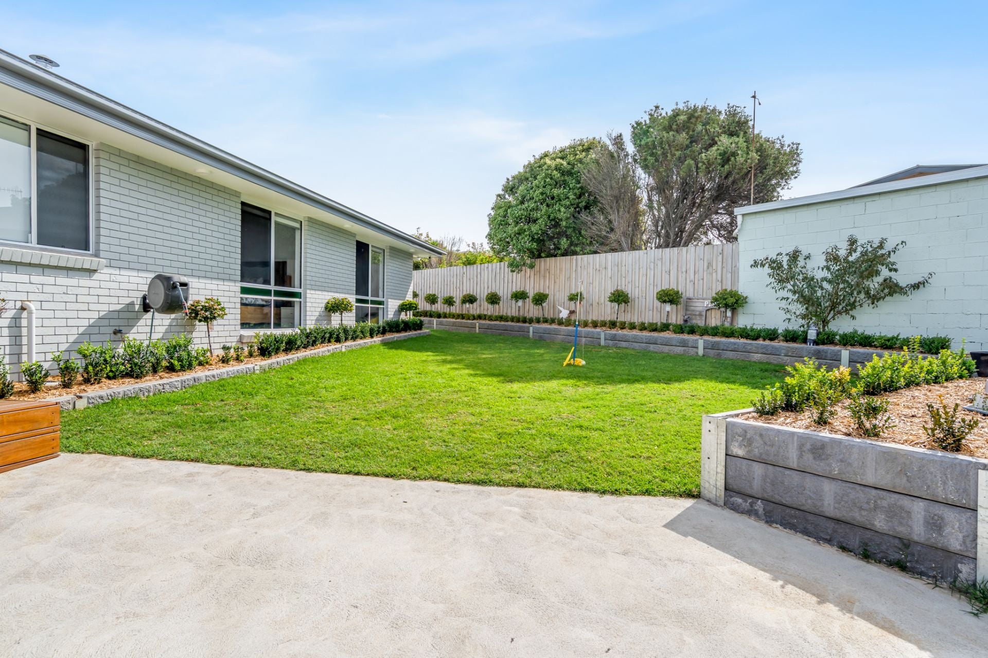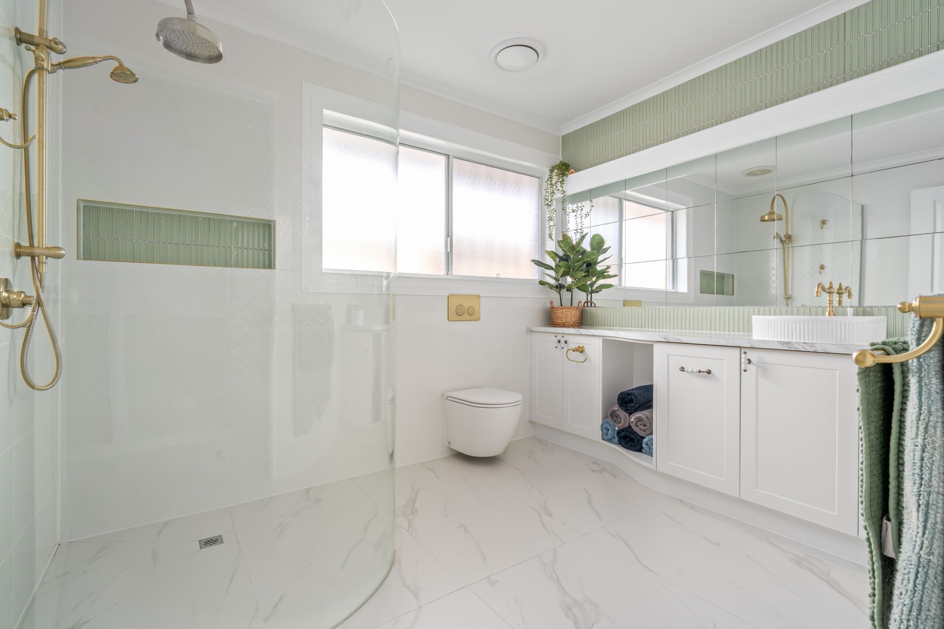 Each of the three bedrooms is light-filled and spacious, with tasteful finishes that continue the home’s elegant theme. The master bedroom offers a serene retreat, complete with a ceiling fan, and a large window overlooking the beautifully landscaped backyard-creating the perfect blend of comfort and style. Two of the bedrooms include built-in robes, adding practical storage without compromising on aesthetics. A stunning main bathroom services the home, with beautiful brass gold fixtures and fittings, a large mirror and ample cabinetry, with a second separate toilet adjacent from the laundry.