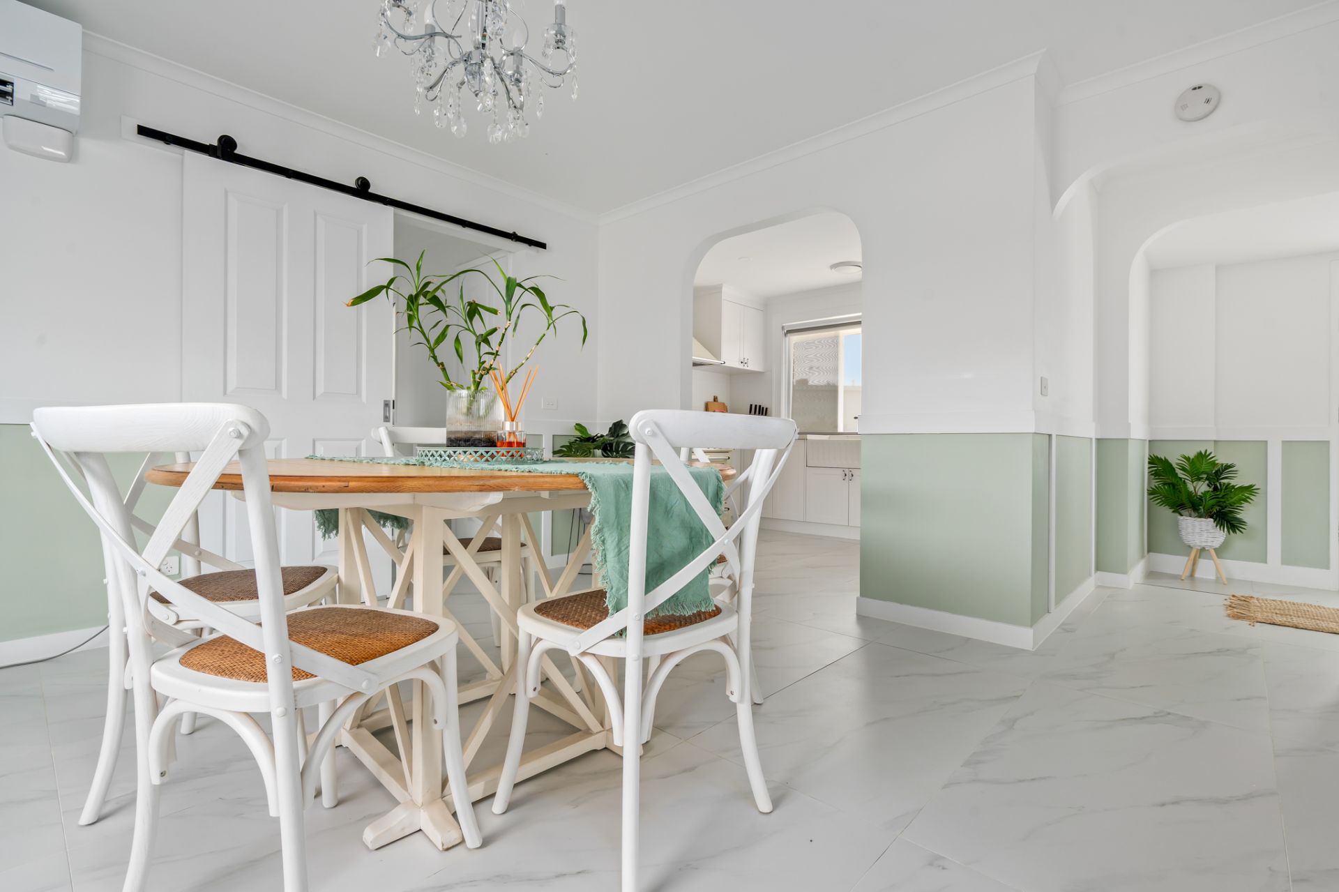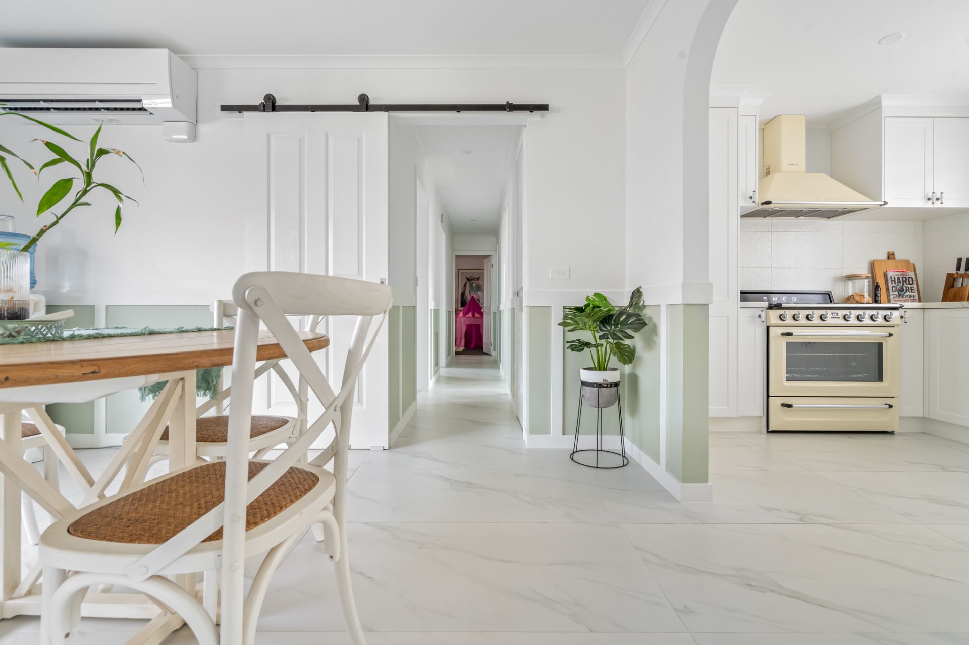 The dining area is equally impressive, radiating charm and sophistication. A statement chandelier casts a warm glow over the space, creating the perfect ambiance for family meals or entertaining guests. Classic wall paneling in soft sage tones adds a touch of elegance, while large-format tiles underfoot enhance the modern feel. A sliding barn door adds character and convenience, seamlessly connecting the dining room to the hallway and beyond.