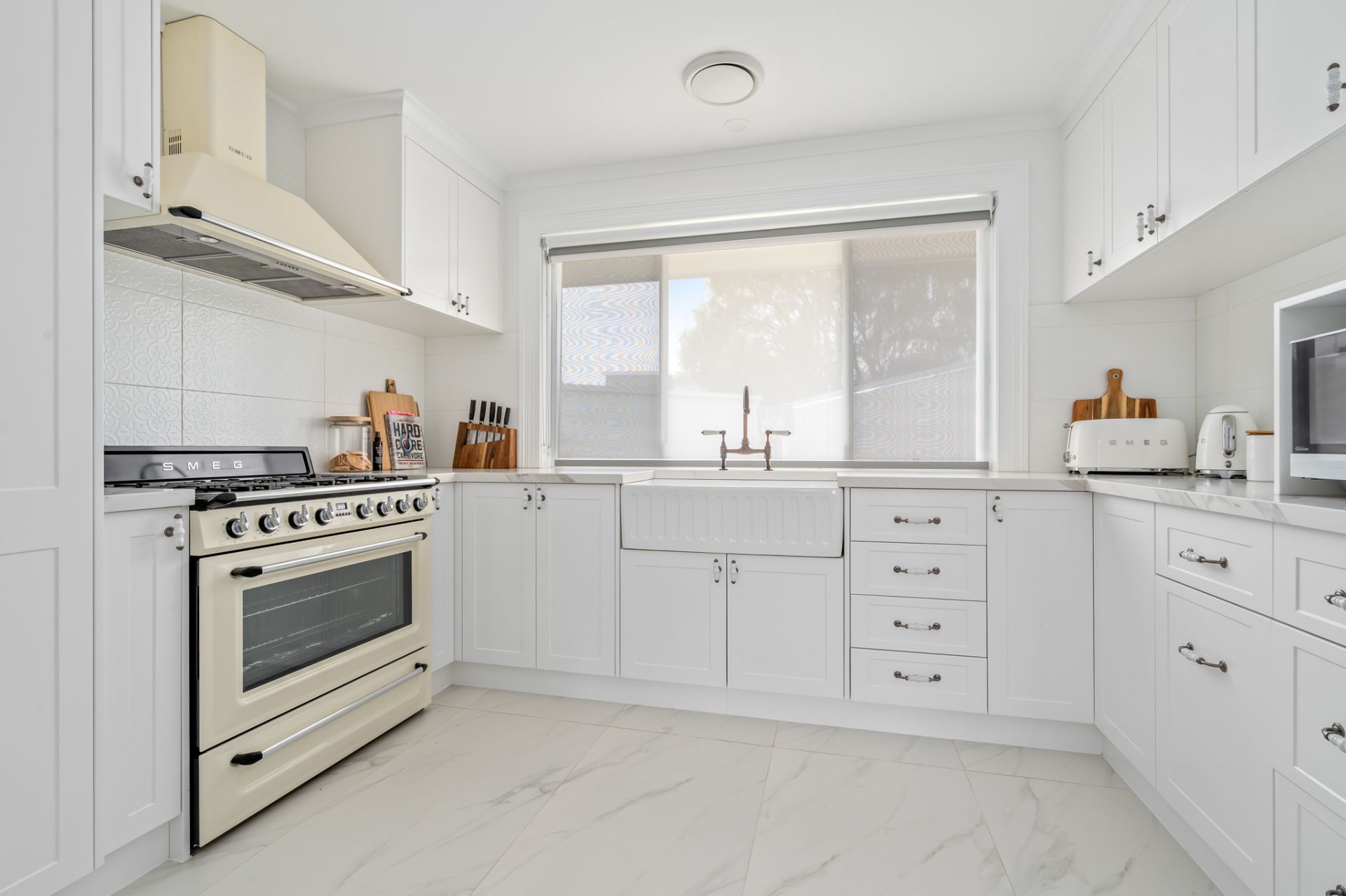 The kitchen is a true showstopper, blending timeless charm with modern functionality. Crisp white cabinetry stretches to the ceiling, offering abundant storage, while elegant marble-look flooring and sleek stone benchtops create a clean and sophisticated aesthetic. A farmhouse-style apron sink is perfectly positioned beneath a wide window that frames a leafy outlook and floods the space with natural light. High-end appliances, including a premium SMEG oven and rangehood, make this kitchen a dream for passionate cooks and entertainers alike.