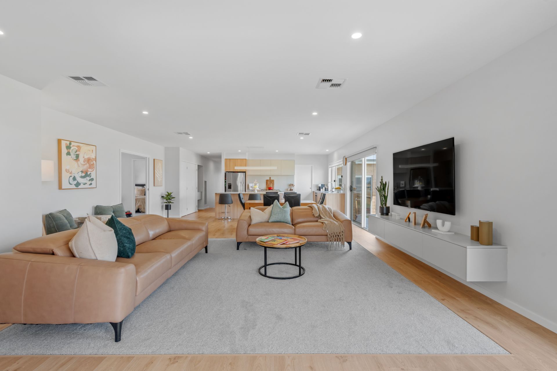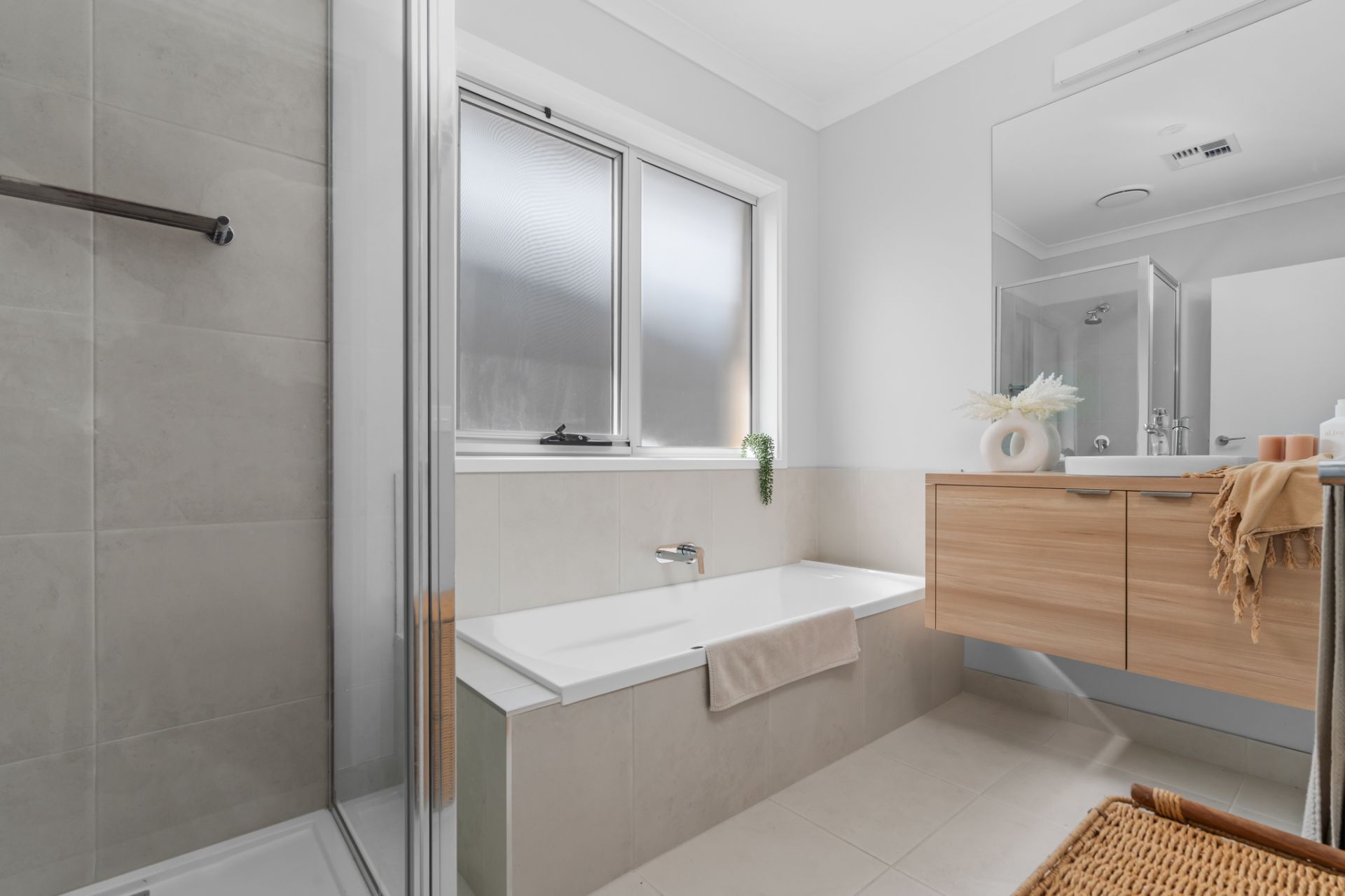 The main bathroom features a floating vanity, separate bath, and shower, offering both style and practicality. The master ensuite provides a private retreat, and all bedrooms include built-in wardrobes. The stylish laundry includes heaps of storage and functional design, keeping your home organised with ease.