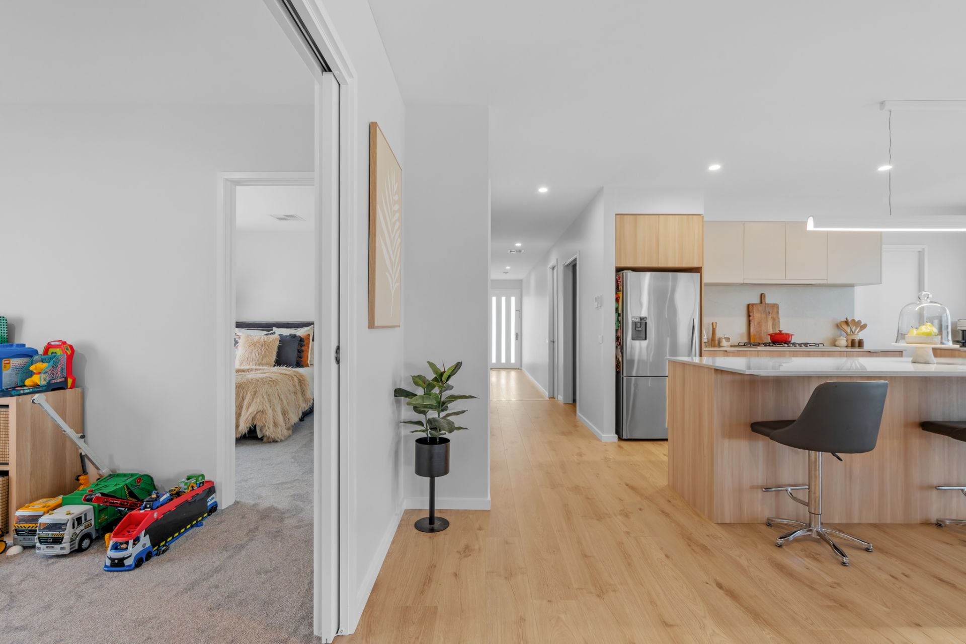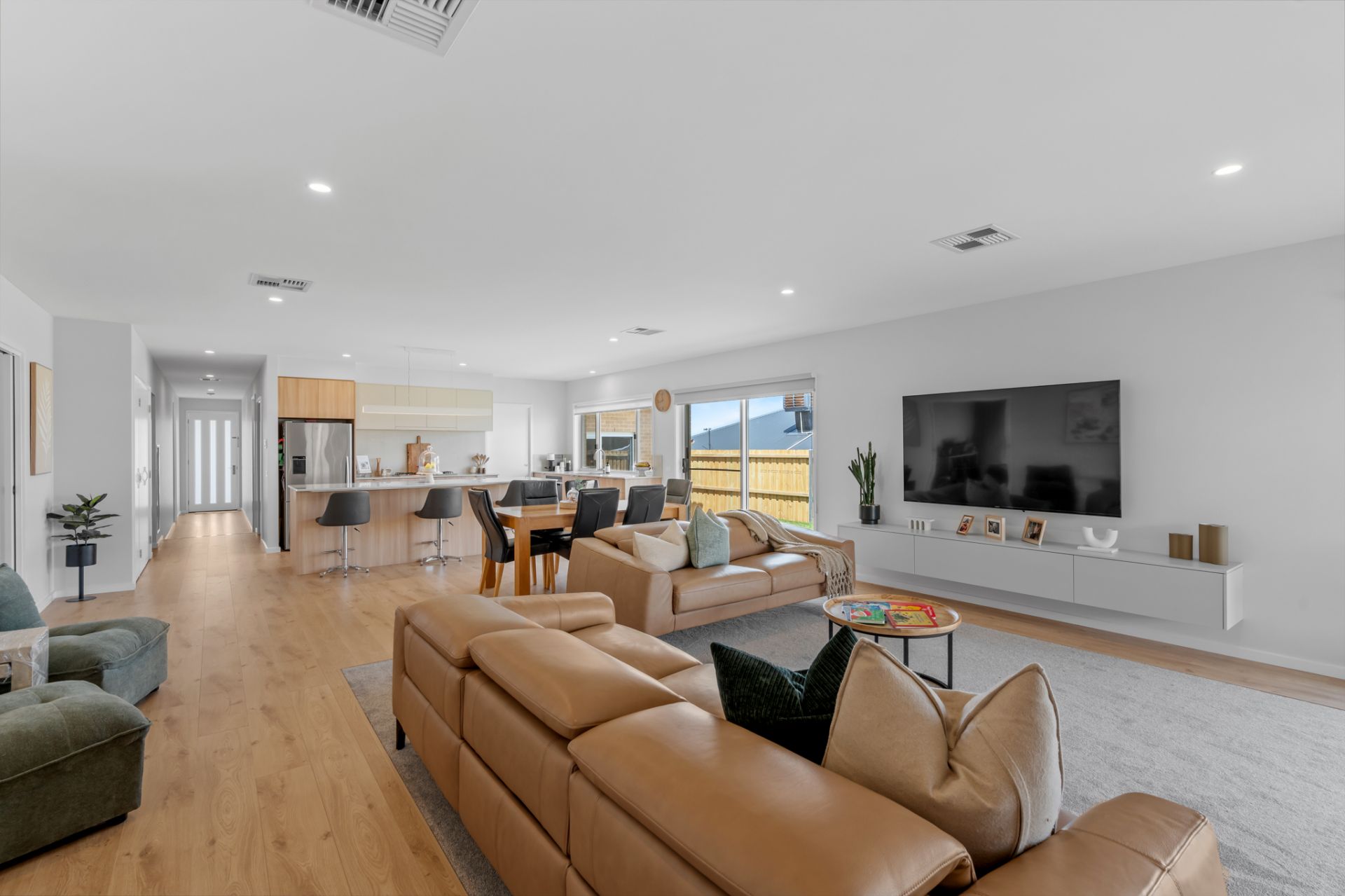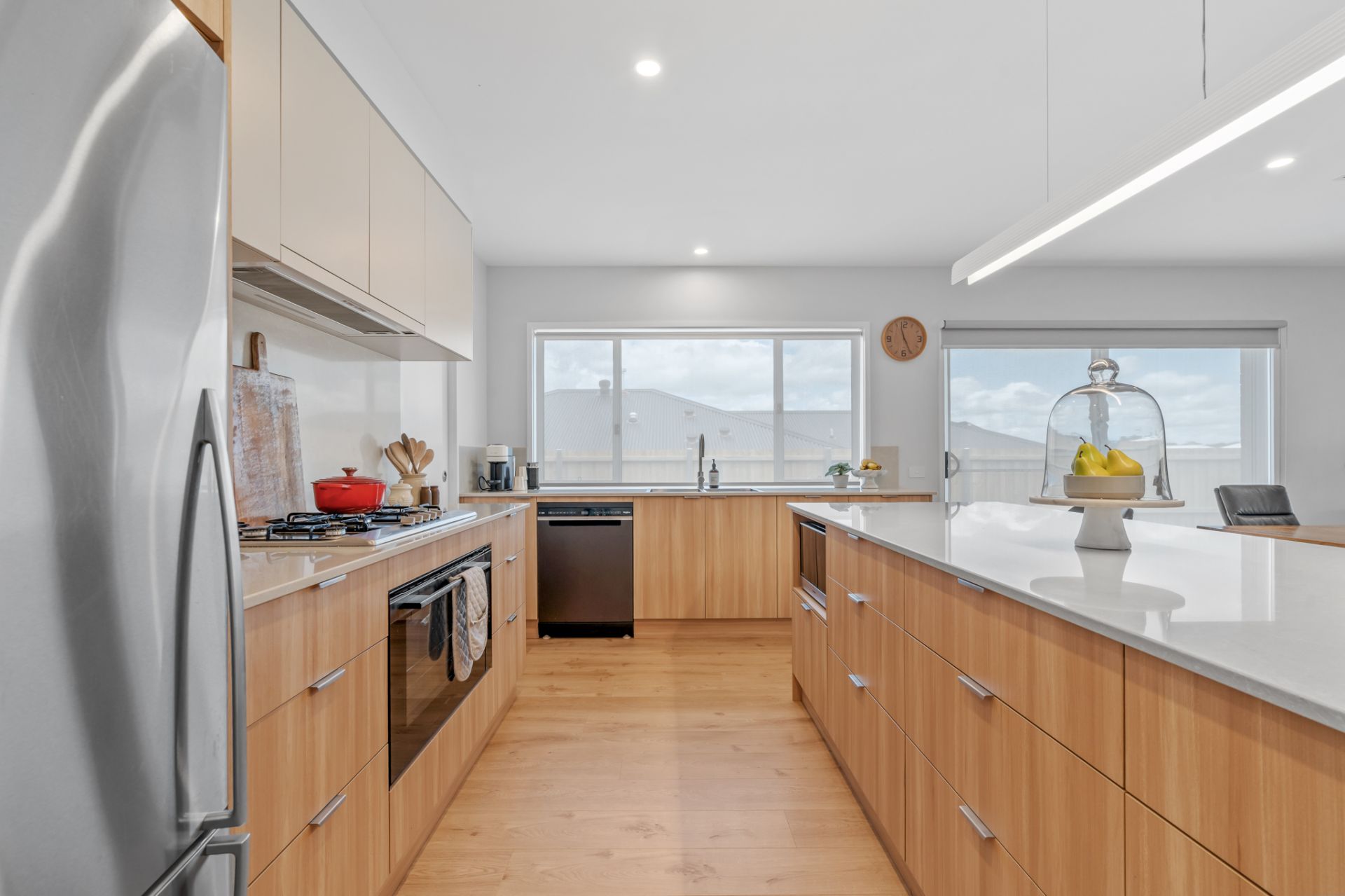 The heart of the home is a bright, open-plan kitchen, living, and dining area, perfect for entertaining or relaxing. The kitchen boasts stone bench tops, a 900mm oven, gas cooktop, dishwasher, and a walk-in butler’s pantry, while the built-in cabinetry ensures ample storage for all your essentials. A convenient study nook makes working from home effortless.
