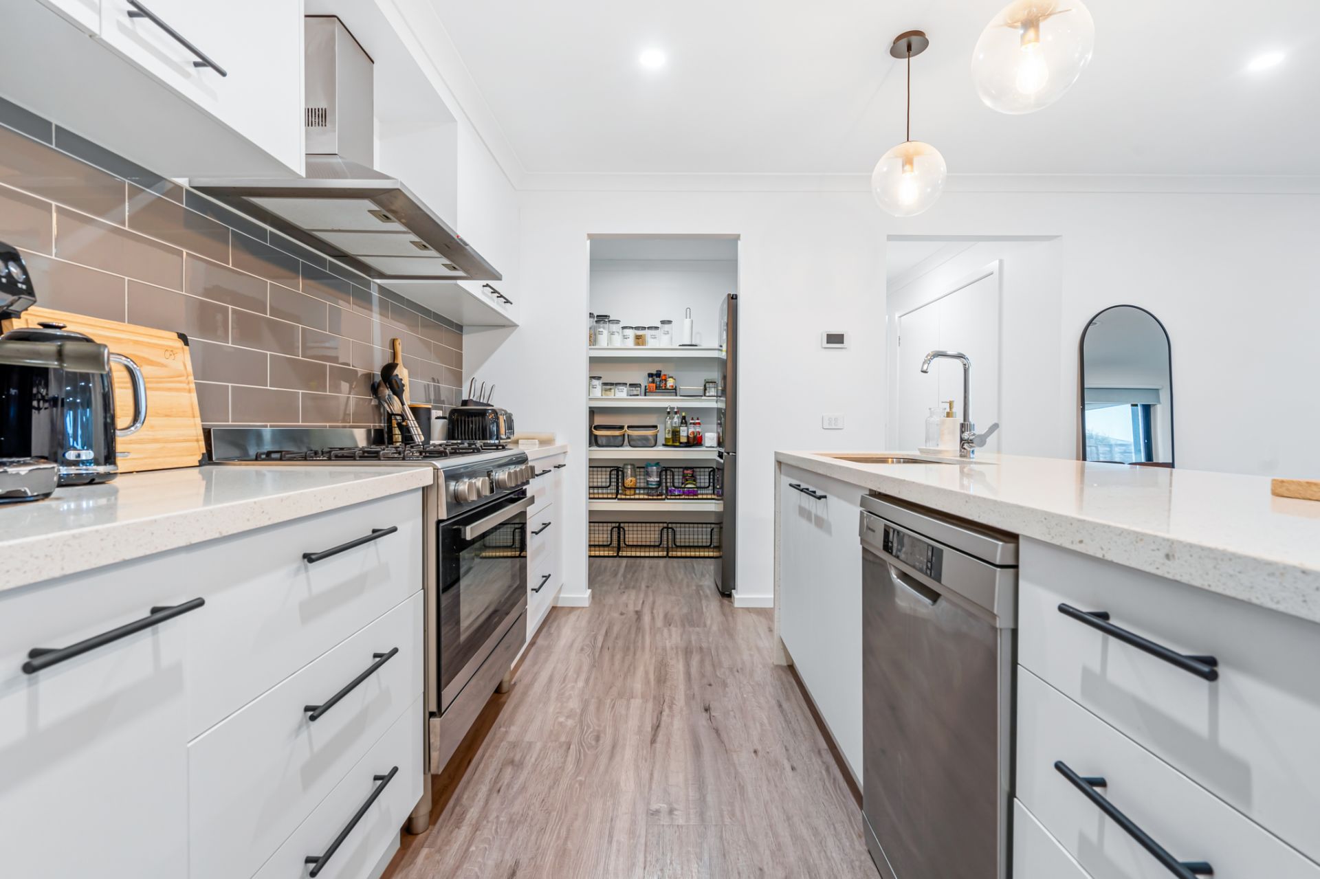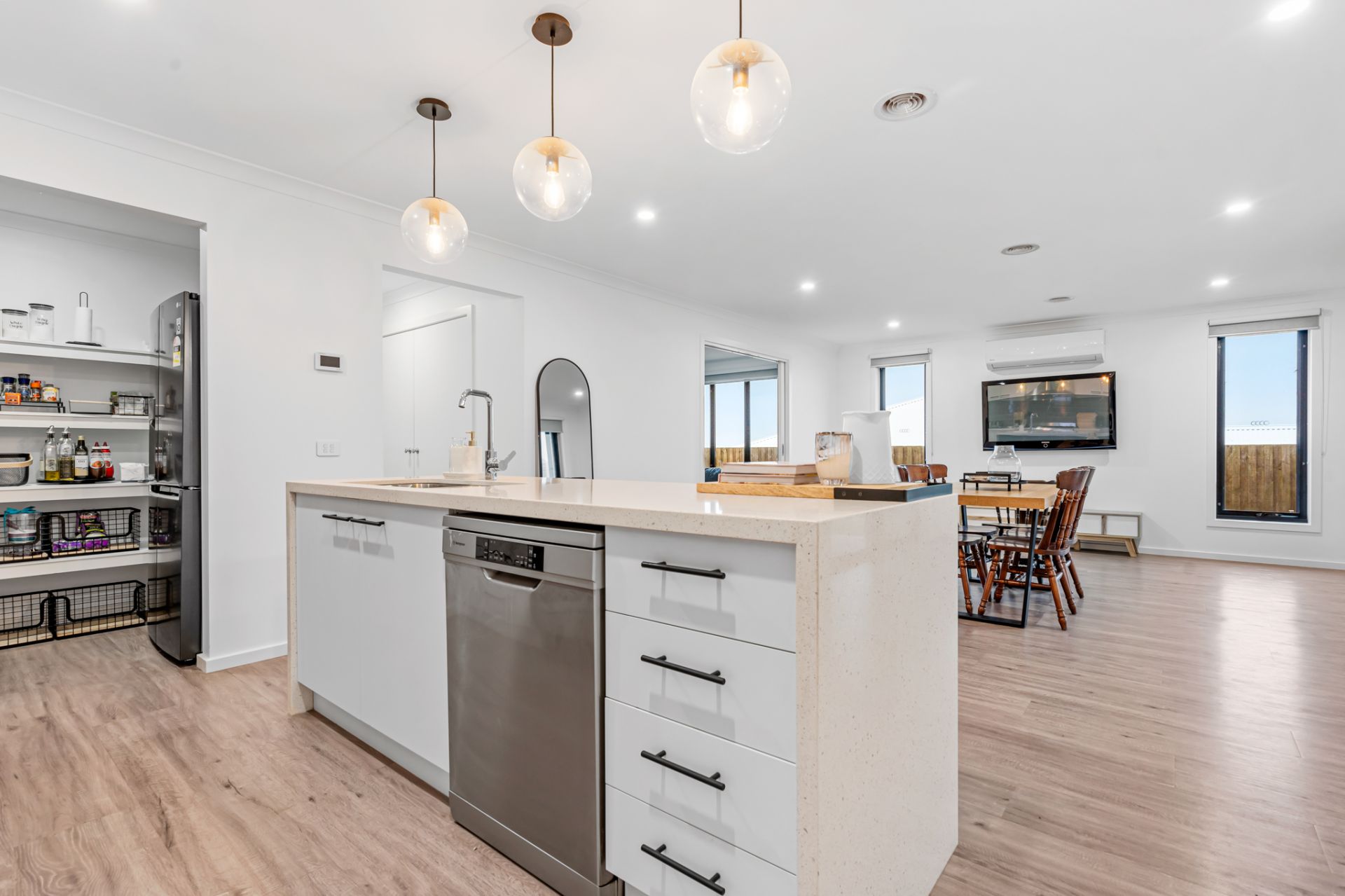 The heart of the home is the expansive open-plan living zone. Here, a stylish kitchen beckons with stone benchtops, oven, dishwasher, and generous walk-in pantry, ensuring culinary endeavours are a joy.