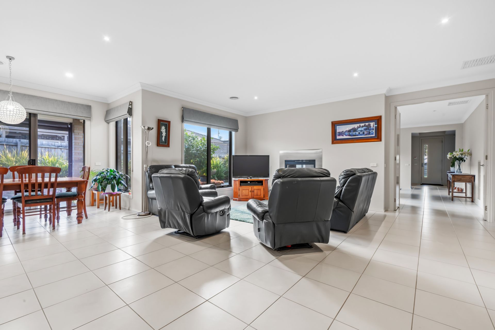 Centrally located in the home is a generous second living room, a perfect retreat or media space, separated by double doors from the main open-plan kitchen, dining, and living area. The highlight here is a cozy double-sided gas fireplace, cleverly positioned to provide warmth and ambiance to both living areas, with the convenience of remote operation. Complementing this are double glazed windows, gas ducted heating, and ducted air conditioning throughout the home, ensuring year round comfort and energy efficiency.